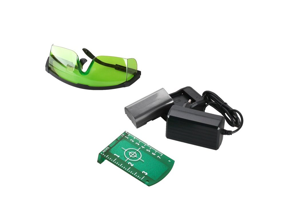 obsah balení : přepravní kufr, Li-ion baterie 2600 mAh, nabíječka, profesionální multifunkční držák, bateriová redukce na AA baterie, 4 x AA alkalické baterie, cílová destička mm / inch, brýle