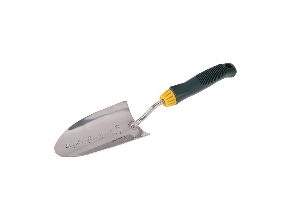 Zahradní lopatka ROSA - nerez, široká, praktická měrka pro snadné docílení správné hloubky při sázení, kvalitní materiál i zpracování, ergonomická plastová rukojeť, délka 36 cm, použití : pro veškeré práce na zahrádce, pro praci s pokojovými rostlinami…, balení : blistr s eurootvorem.