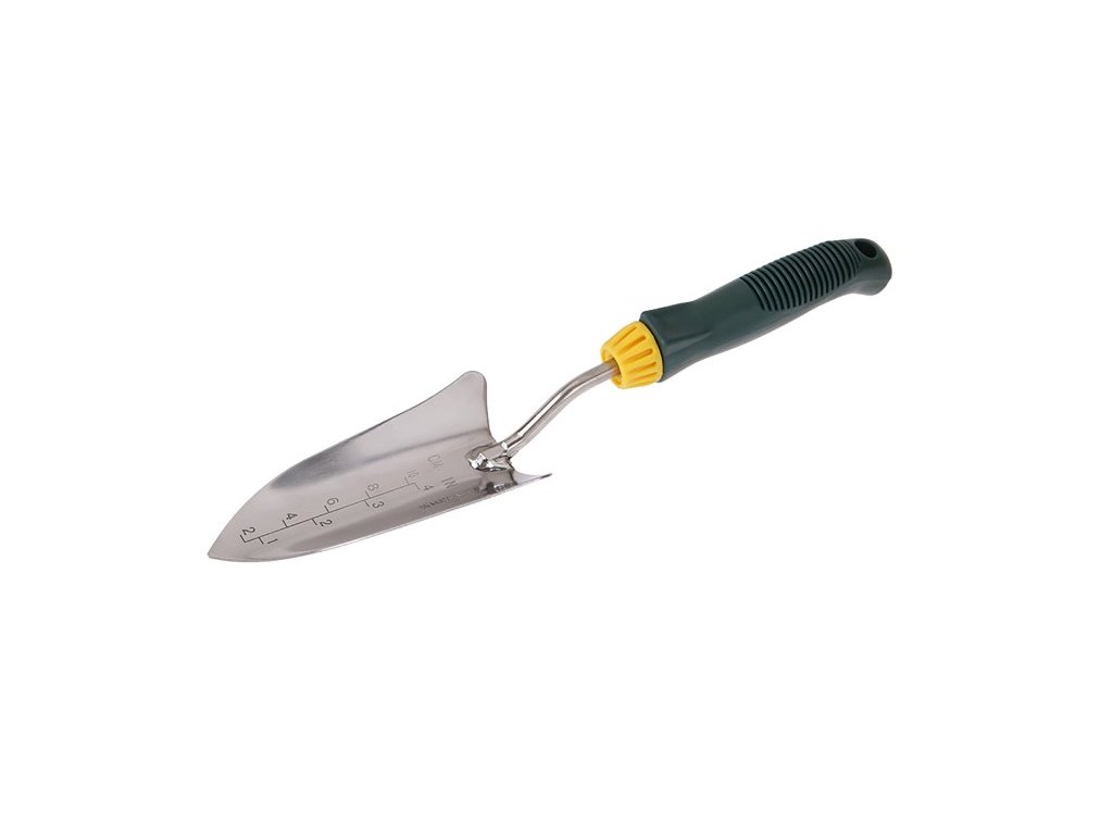 Zahradní lopatka ROSA - nerez, úzká, praktická měrka pro snadné docílení správné hloubky při sázení, kvalitní materiál i zpracování, ergonomická plastová rukojeť, délka 35 cm, použití : pro veškeré práce na zahrádce, pro praci s pokojovými rostlinami…, balení : blistr s eurootvorem.