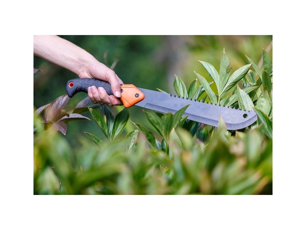 Mačeta je ideální na odstranění menších větví, stromů či polen, loupání kůry z kulatiny a odsekání větví z kmene, v lesnictví i zahradnictví. Dále pro použití při turistice, rybaření, kempování apod. Neklouzavá gumová rukojeť umožňuje jistý úchop, absorbuje otřesy způsobené používáním, snižuje únavu a dovoluje přenos maximálního množství energie úderu do ostří nástroje. Vyrobená ze zušlechtěné oceli s broušeným ostřím. Mačeta má v horní části čepele dírku, takže ji lze pověsit na stěnu. Na horní hraně je vybavena zubovou pilkou. Součástí je nylonové pouzdro se zapínáním na suchý zip.