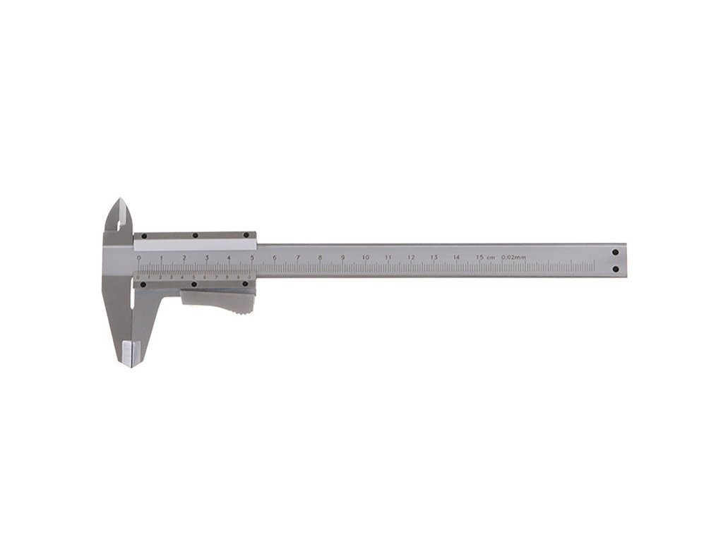 Posuvné měřidlo 0 - 150 mm s přesností 0,02mm, metrická stupnice v mm, hloubkoměr, kvalitní nerezová ocel, přesné zpracování, plynulý posuv, tlačítková aretace, tabulka převodů jednotek, plastové pouzdro.