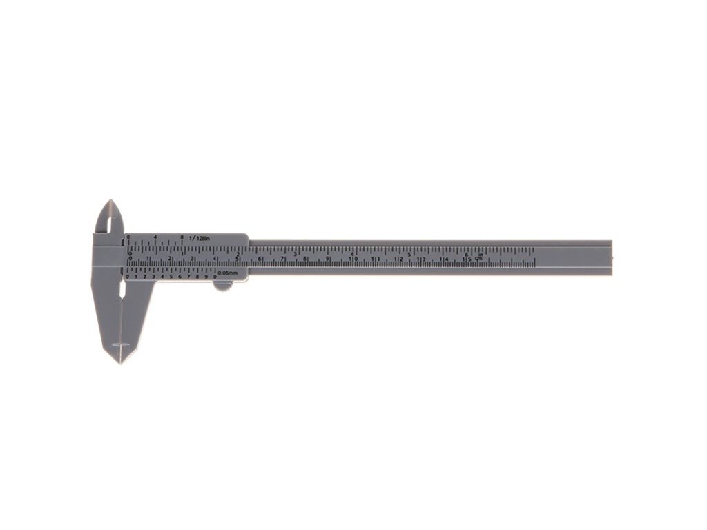 Plastové posuvné měřidlo 150mm, dělená stupnice v mm a palcích, pro orientační měření.