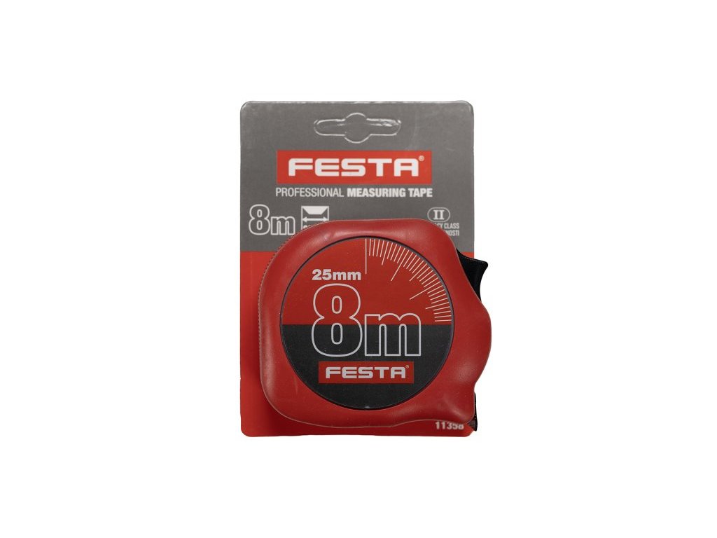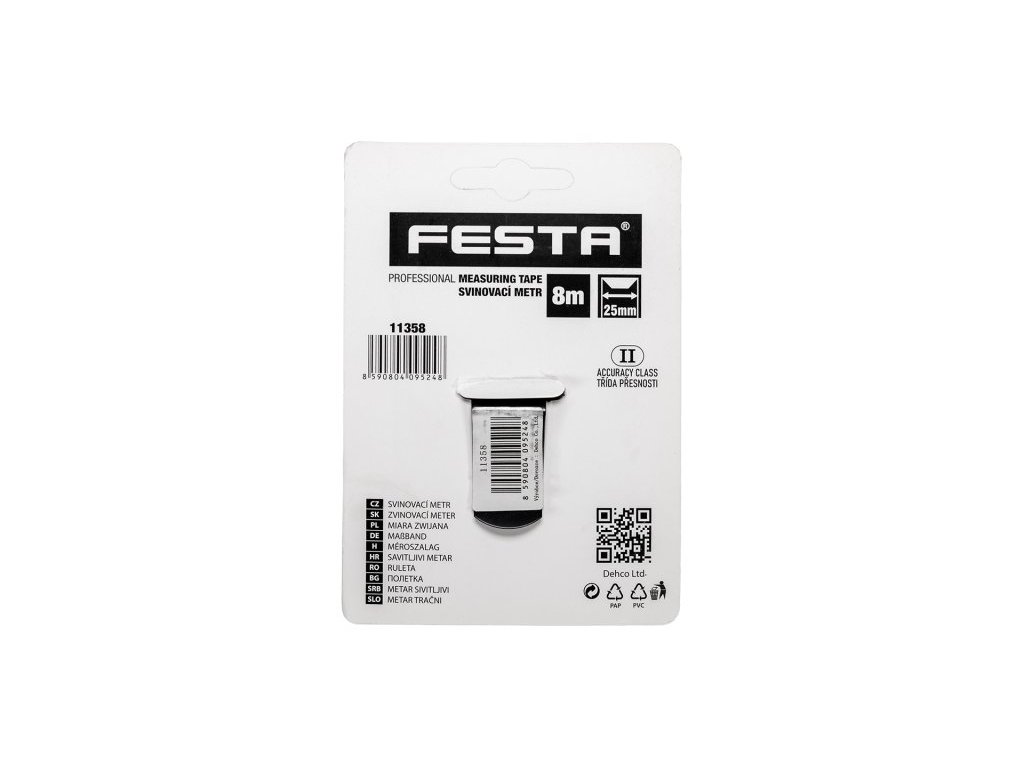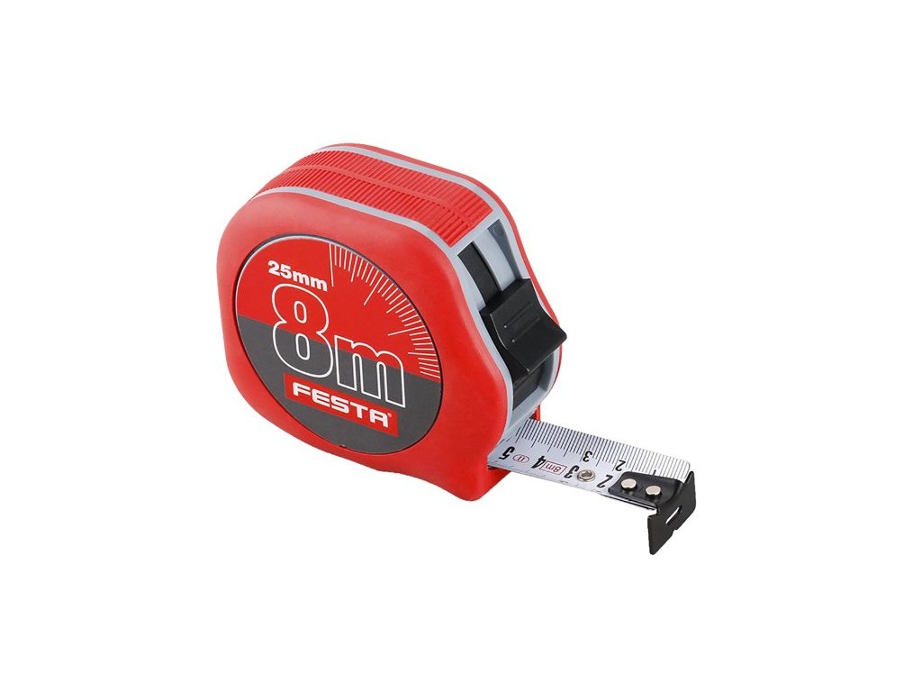 metr svinovací 8 m x 25 mm II. třída přesnosti otěruvzdorná nylonová vrstva - ochrana pásky kalená páska, tělo z ABS plastu a TPE gumy, "satin finish" háček s plovoucím uchycením pro vnitřní i vnější měření klip na opasek, baleno na blistru