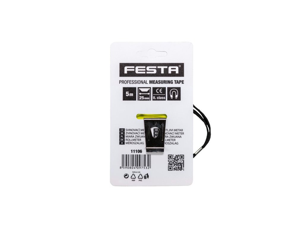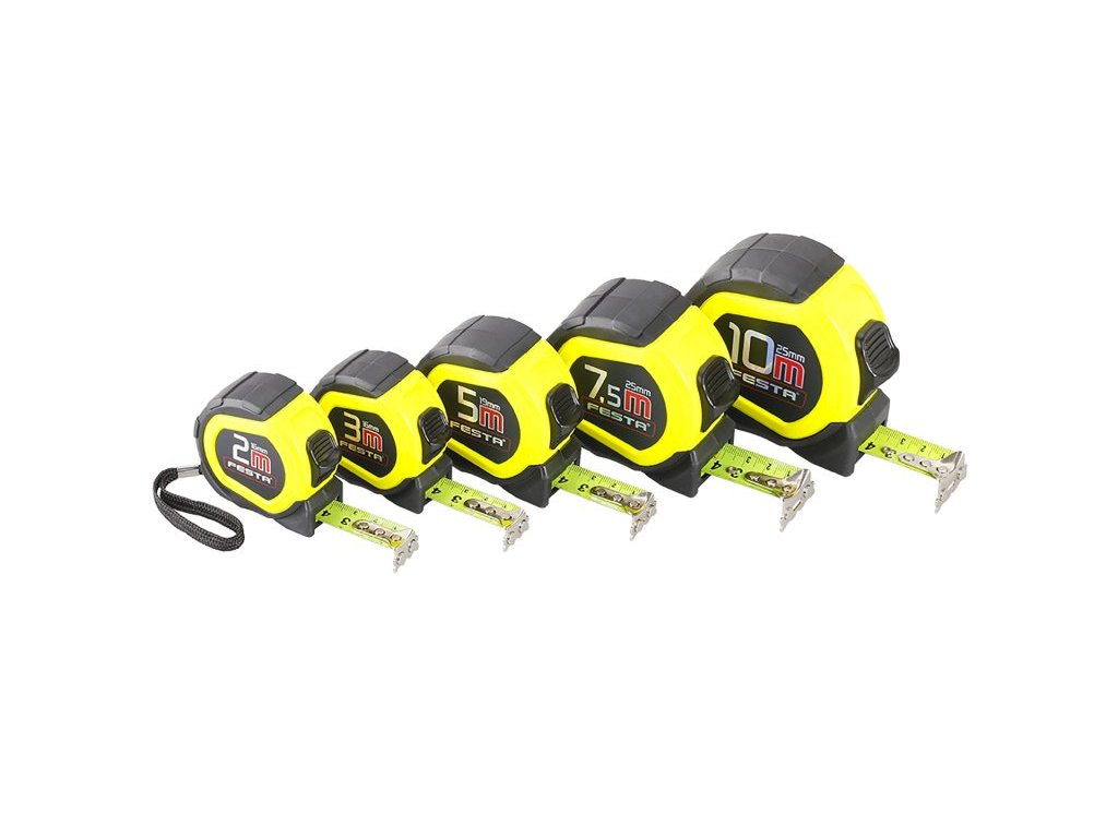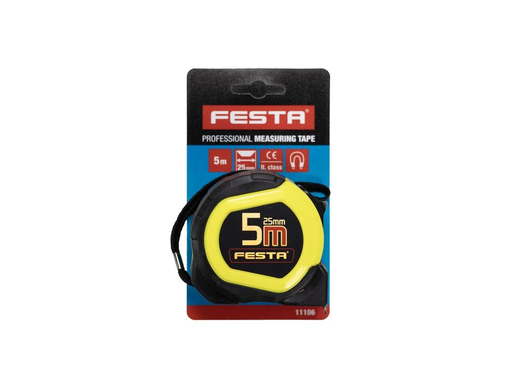 svinovací metr FESTA magnetic II. třída přesnosti, CE - certifikát, metr vhodný ke kalibraci kalená páska, fluorescenční vrstva - dobře čitelná stupnice i v horších světelných podmínkách, magnetický háček pouzdro metru z ABS plastu s gumovou ochranou - vyšší odolnost proti poškození při nárazech, lepší manipulace a úchop metru poutko, klip na opasek