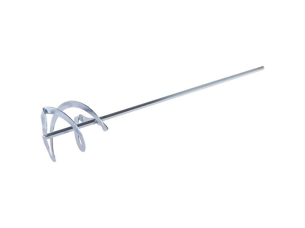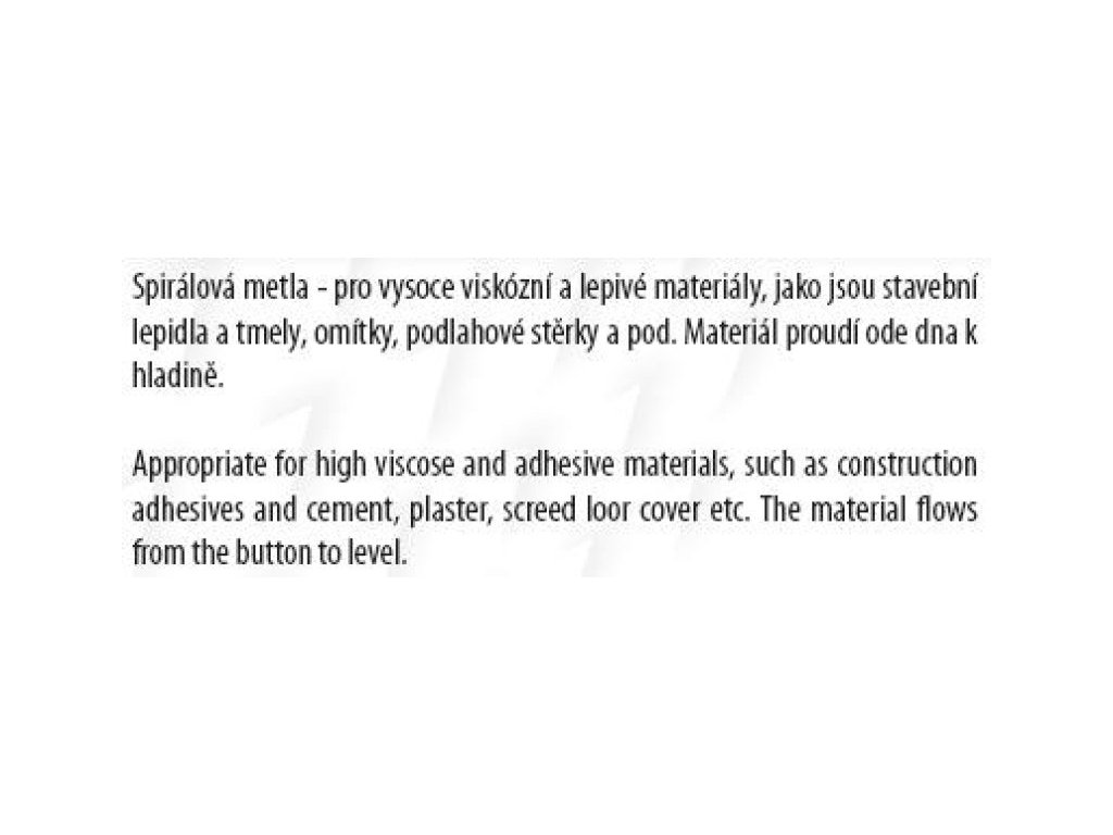 Míchadlo - spirála( metla ), pozinkované, rozměr: 90 x 500 mm, použití: spirálová metla se používá pro vysoce viskózní a lepivé materiály, jako jsou stavební lepidla a tmely, omítky, podlahové stěrky apod, materiál proudí ode dna k hladině.