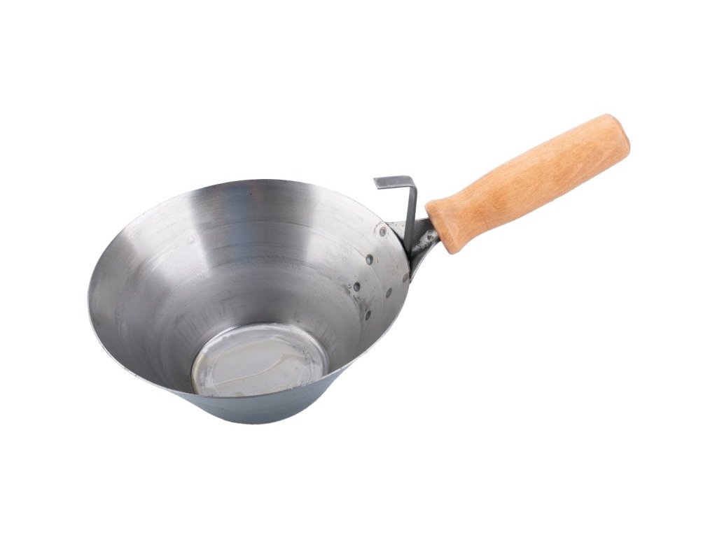Zednická naběračka 180 mm s dřevěnou ručkou a s háčkem na pověšení. Zednické nářadí používané pro přemisťování stavebních hmot: malta, beton atd.