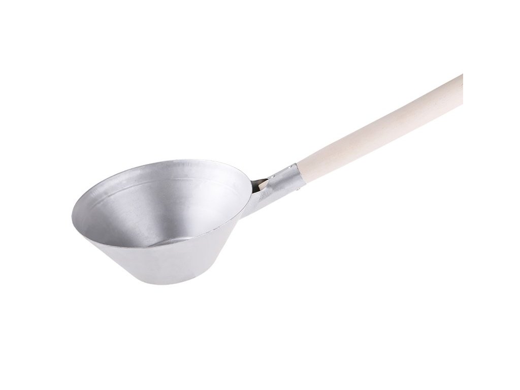 Zednická naběračka (fanka) s dřevěnou násadou o průměru 235 mm a délce 160 cm. Použití: přemisťování stavebních hmot (malta, beton).
