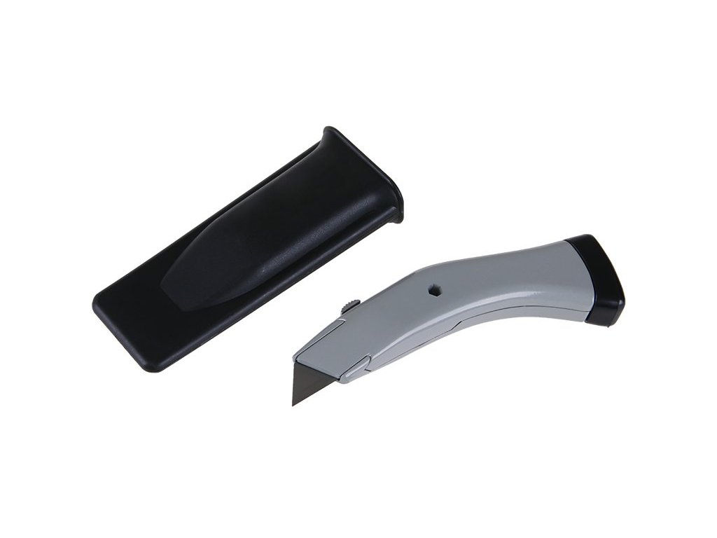 Kovový nůž s výsuvnou lichoběžníkovou čepelí, čepel uchycena uvnitř těla nože na posuvném jezdci, ergonomický tvar, dvoupolohová patka umožňuje snadné rozebrání a výměnu čepele, plastové pouzdro s klipem na opasek.