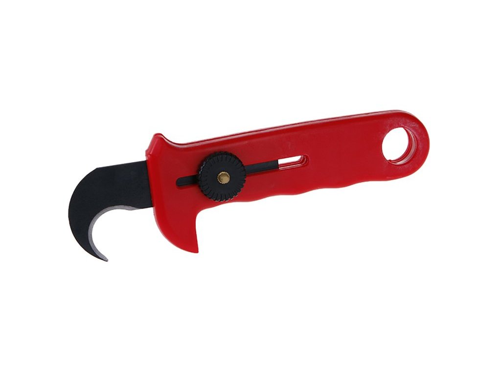 Plastový nůž s hákovou čepelí, odolná šroubková aretace, bezpečné uložení ostří v rukojeti nože, vhodný na podlahoviny, kůži, textilie.. .