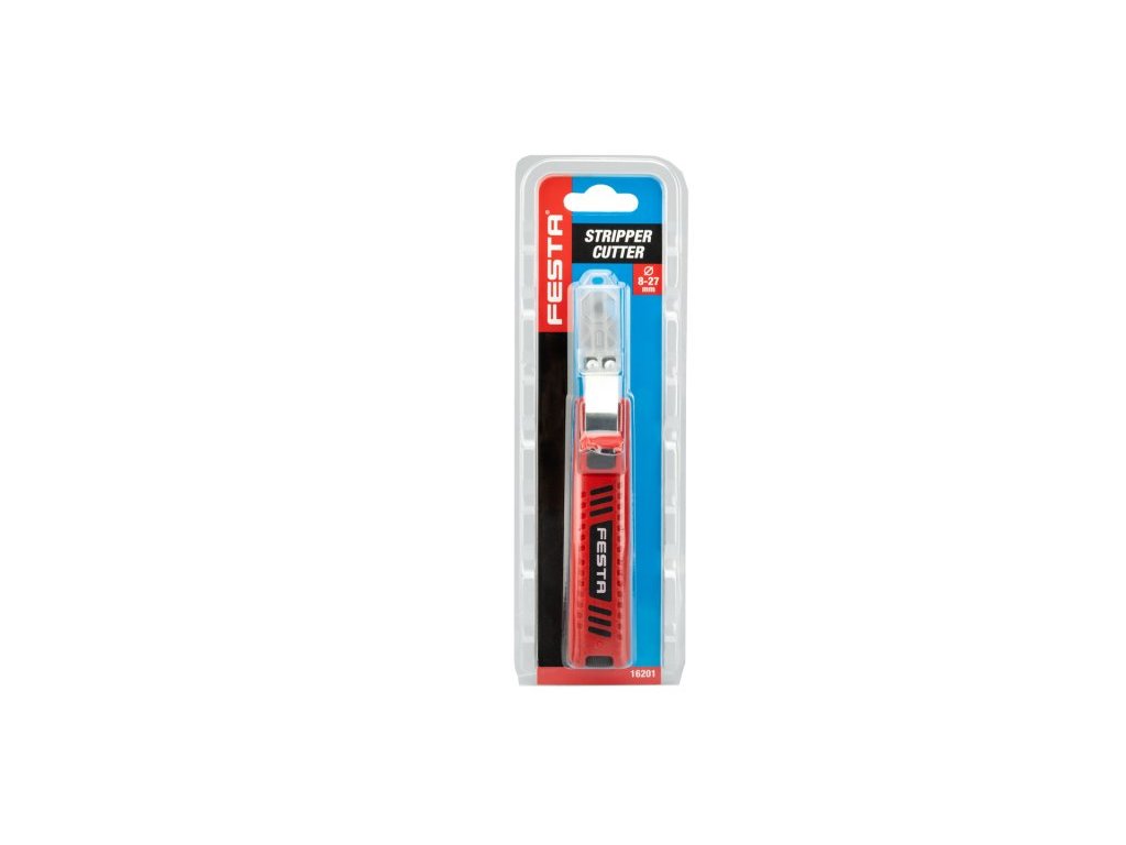 Speciální nůž pro odizolovávání vodičů, otáčecí nůž pro kruhové a podélné řezy kabelů o průměro 8-27 mm, nastavitelný držák kabelů se automaticky přizpůsobí danému kabelu, plášt rozřízneme kruhovým otočením a tažením nože po délce kabelu, blistr.