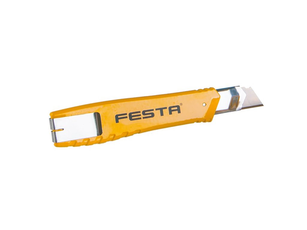 odlamovací nůž FESTA s velmi odolnou a pevnou hliníkovou konstrukcí automatický zámek polohy čepele umožňuje snadné vysouvání a zasouvání čepele současně drží pevně vysunutou čepel při řezání v nastavené pozici štíhlá konstrukce těla pro snadné ovládání a přesně vedený řez čepel 18 mm nerezová spona pro upevnění na opasek či kapsu prodejní box 24 ks