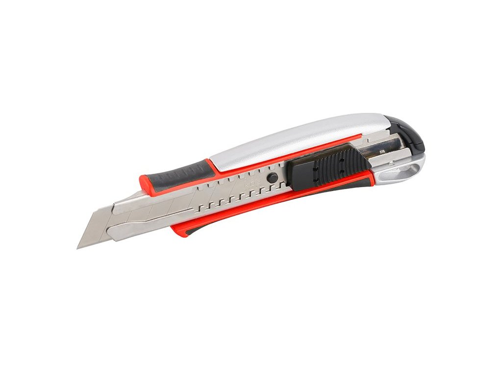 odlamovací nůž s kovovým tělem a vyztuženým vedením čepele tlačítkový posuv s automatickou aretací pogumované části těla nože pro neklouzavý úchop
