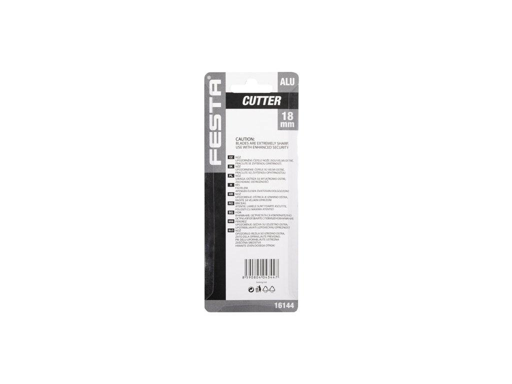 Odlamovací nůž FESTA 18mm, kvalitní materiály, celokovové tělo nože, protiskluzné plastové výstupky, kovová lišta, odolná šroubková aretace, do nože lze umístit až 2 náhradní břity, blistr.