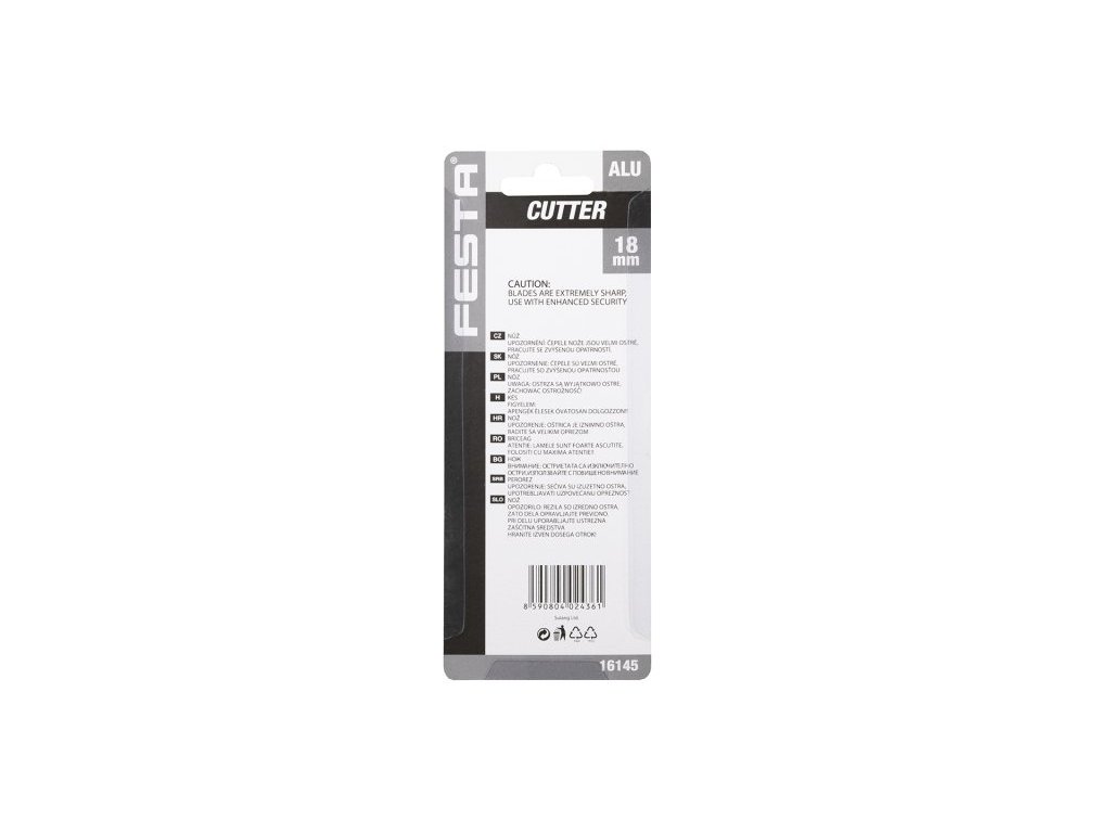 Odlamovací nůž FESTA 18mm, kvalitní materiály, celokovové tělo nože, protiskluzné plastové výstupky, kovová lišta, automatická posuvná aretace, do nože lze umístit až 2 náhradní břity, blistr.