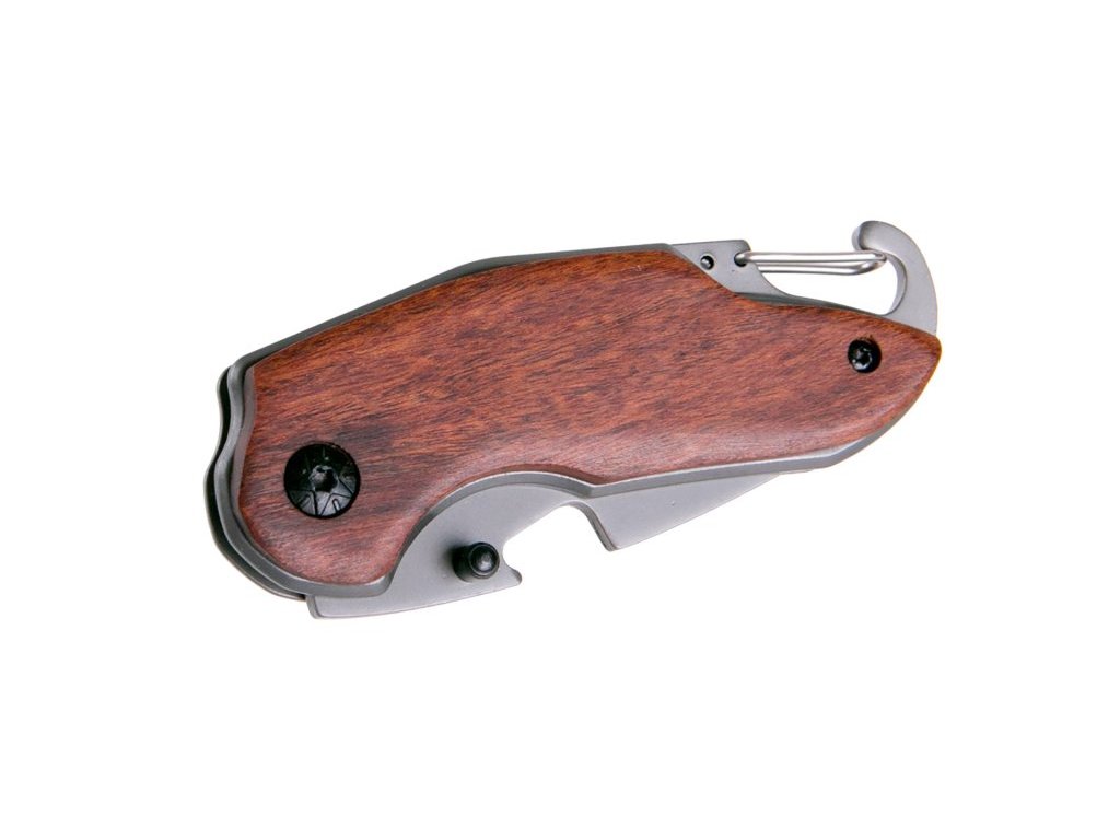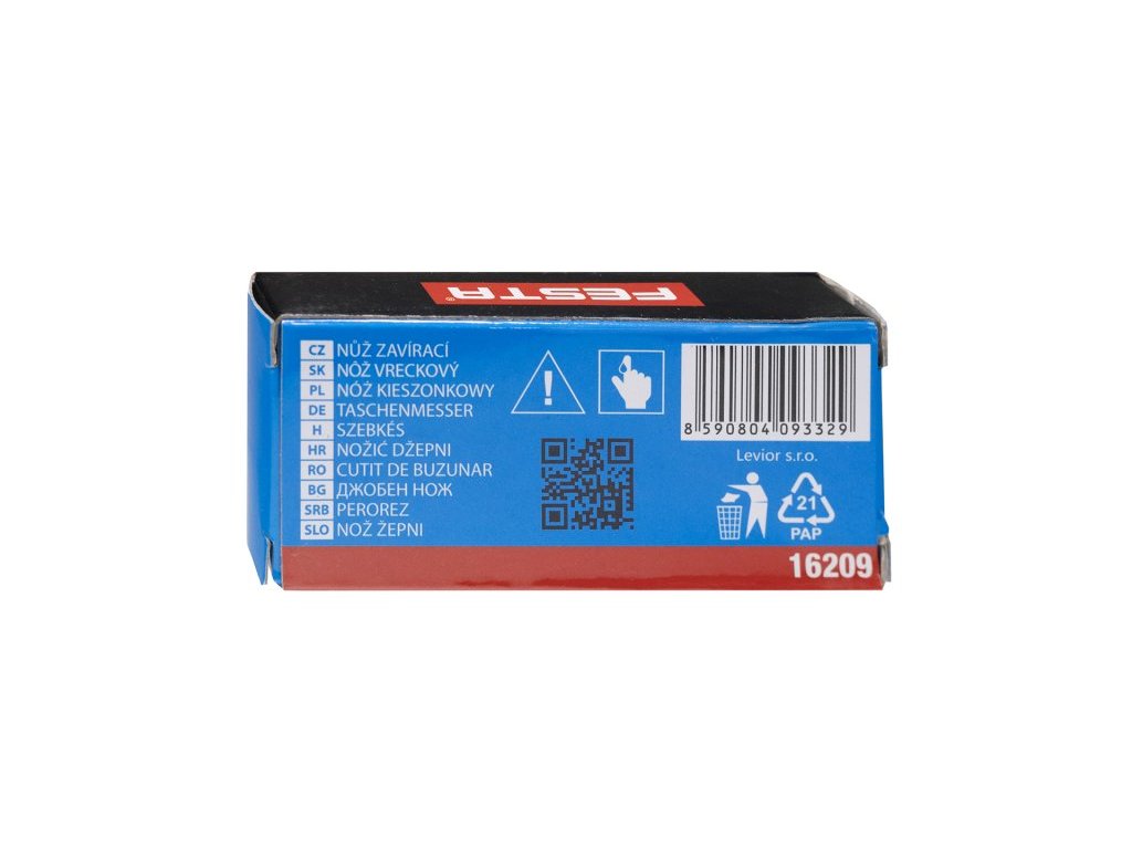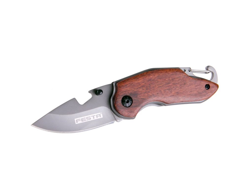 Malý kapesní nůž FESTA, kompatní rozměry, kvalitní čepel i zpracování, ostří zajištěno pojistkou proti zavření, karabina v rukojeti pro zavěšení na klíče, řetizek, atd., v čepeli výsek použitelný jako otvírák na lahve. Baleno v krabičce.