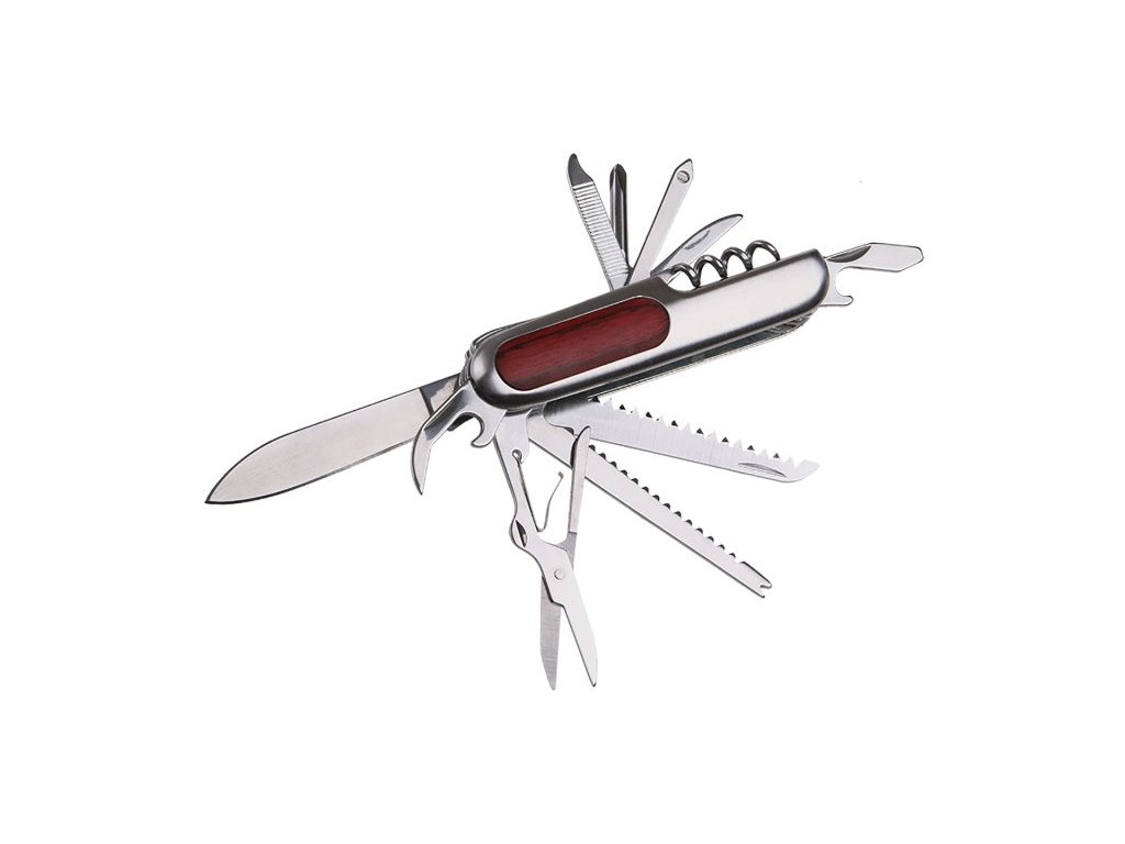 Nůž kapesní multifunkční INOX. Délka zavřeného nože 95 mm. Nerezový multifunkční nůž s 11 různými částmi pro různé způsoby použití. Rukojeť v kombinaci kov - dřevo. Hmotnost 0,666 kg.