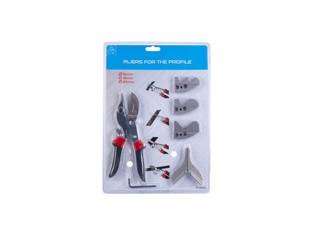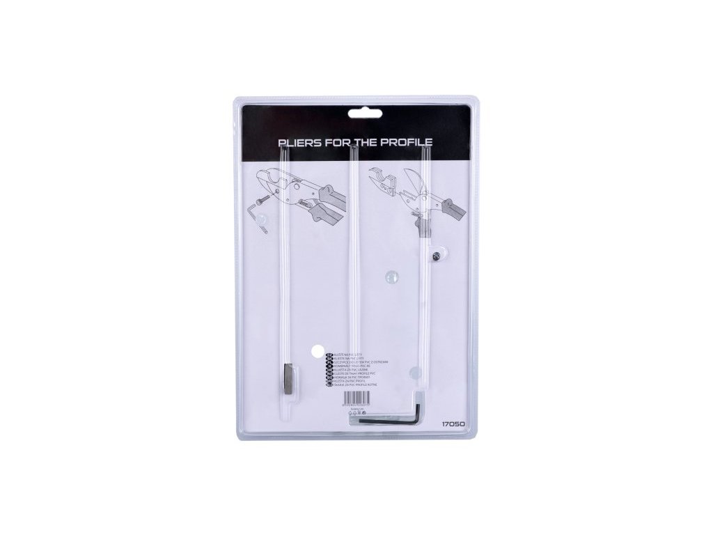 Kleště na PVC lišty a trubky, kleště s kaleným ostřím a výměnnými čelistmi, pro střihy PVC lišt s nastavitelnými úhly a PVC trubky, ergonomické rukojeti, blistr.