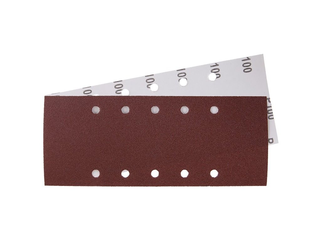 Brusný papír - sada 5kusů, zrnitost: 100, typ : 10 otvorů, druh zrna: oxid hlinitý, pojivo: syntetická pryskyřice, podkladový materiál: pružný papír C (110-135g/m2), rozměry : uvedeny v názvu výrobku, balení : blistr s papírovou kartou s eurootvorem.