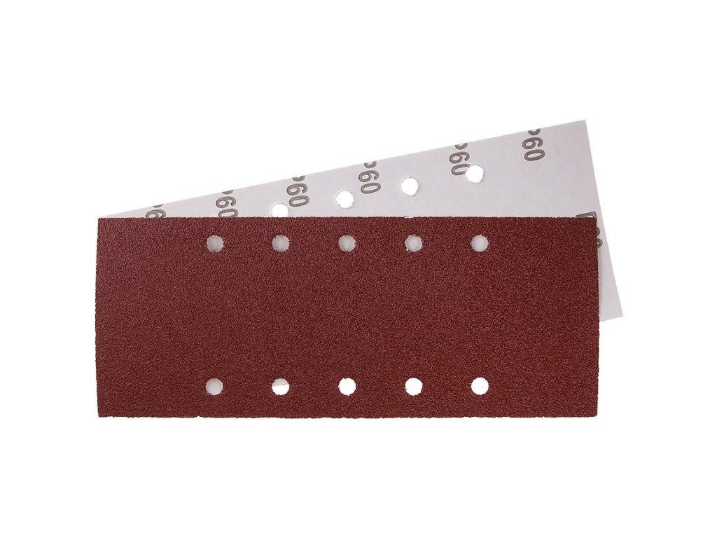 Brusný papír - sada 5kusů, zrnitost: 60, typ : 10 otvorů, druh zrna: oxid hlinitý, pojivo: syntetická pryskyřice, podkladový materiál: pružný papír C (110-135g/m2), rozměry : uvedeny v názvu výrobku, balení : blistr s papírovou kartou s eurootvorem.