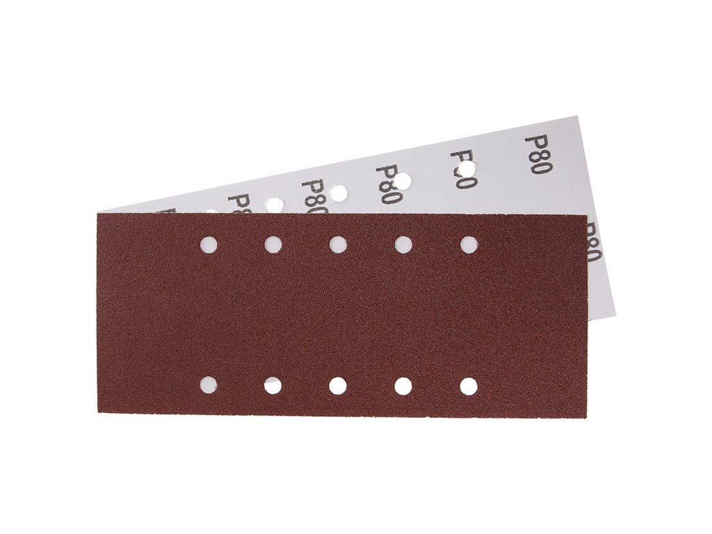 Brusný papír - sada 5kusů, zrnitost: 80, typ : 10 otvorů, druh zrna: oxid hlinitý, pojivo: syntetická pryskyřice, podkladový materiál: pružný papír C (110-135g/m2), rozměry : uvedeny v názvu výrobku, balení : blistr s papírovou kartou s eurootvorem.