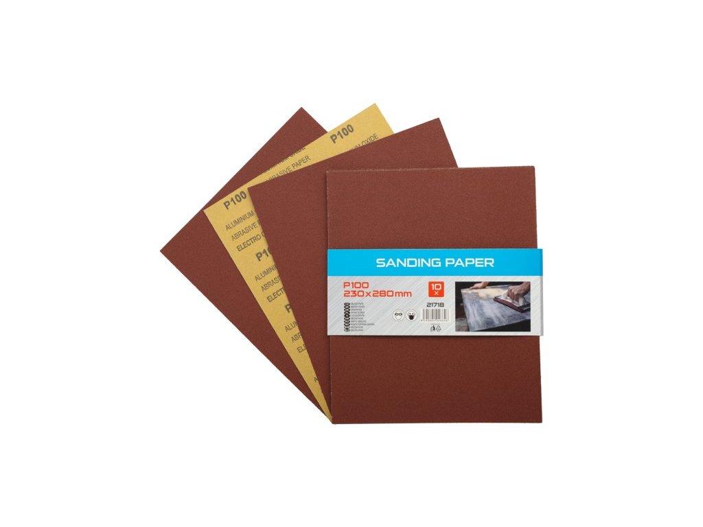 Smirkový papír - sada 10 kusů, zrnitost: 100, druh zrna: oxid hlinitý, pojivo: syntetická pryskyřice, podkladový materiál : pružný papír C (110-135g/m2), rozměry : uvedeny v názvu výrobku, balení : 10 kusů - papírový návlek.