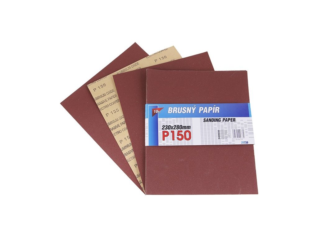 Smirkový papír - sada 10 kusů, zrnitost: 150, druh zrna: oxid hlinitý, pojivo: syntetická pryskyřice, podkladový materiál : pružný papír C (110-135g/m2), rozměry : uvedeny v názvu výrobku, balení : 10 kusů - papírový návlek.