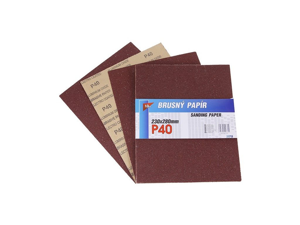 Smirkový papír - sada 10 kusů, zrnitost: 40, druh zrna: oxid hlinitý, pojivo: syntetická pryskyřice, podkladový materiál : pružný papír C (110-135g/m2), rozměry : uvedeny v názvu výrobku, balení : 10 kusů - papírový návlek.