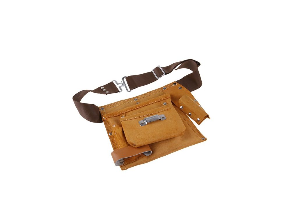 Nářaďový pás, PROFI - kvalitní silná kůže i zpracování - švy, 6 kapes, kůže / nylon, použití : k uložení nářadí a pomůcek, usnadňuje manipulaci a práci - snadné odkladání nářadí i opětovné uchopení, uložení materiálu - hřebíků, šroubů…, komfortní široký nastavitelný pás.