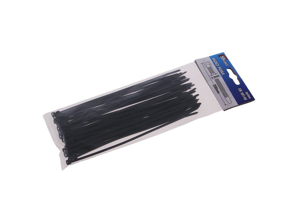 páska nylonová vázací - stahovací pásky splňují normu EN 50146 (Kabelové vázací spony pro elektrické instalace) minimální pracovní teplota 0°C, teplotní rozsah -40 až 85 °C, UV stabilní pevnost v tahu 18 kg, průměr stažení od 5 až do 53 mm