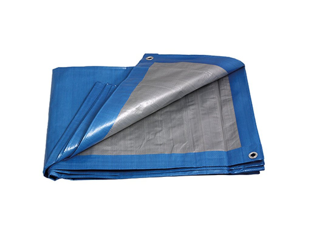 nepromokavá zakrývací PE plachta, gramáž 140 g / m2 barevné provedení modro - stříbrná materiál - PE vlákna o vysoké hustotě, počet přízí na čtvereční palec - 12x10, jemnost příze: 900 denier, oboustraně laminovaná, zesílené rohy, otěru odolná ochrana proti UV záření hmotnost 5600g