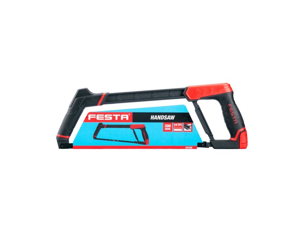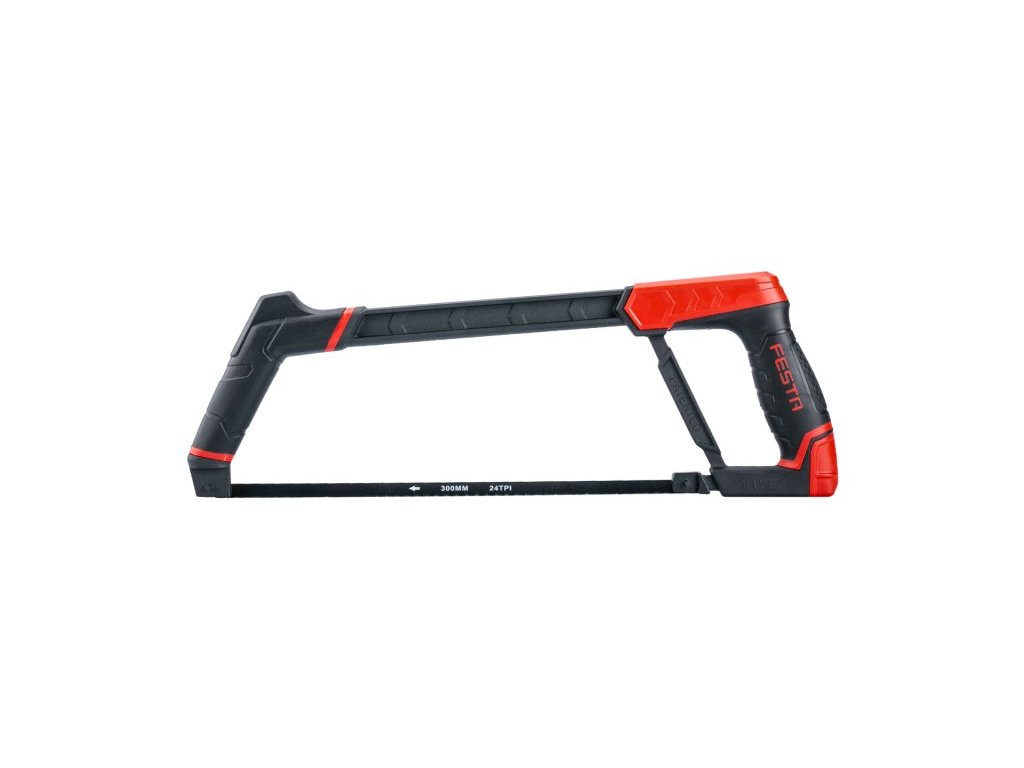 Hliníkový rám, měkčená gumová PTR rukojeť, 300mm ocelový plátek s kalenými zuby, plastový šroub pro rychlou výměnu plátku.