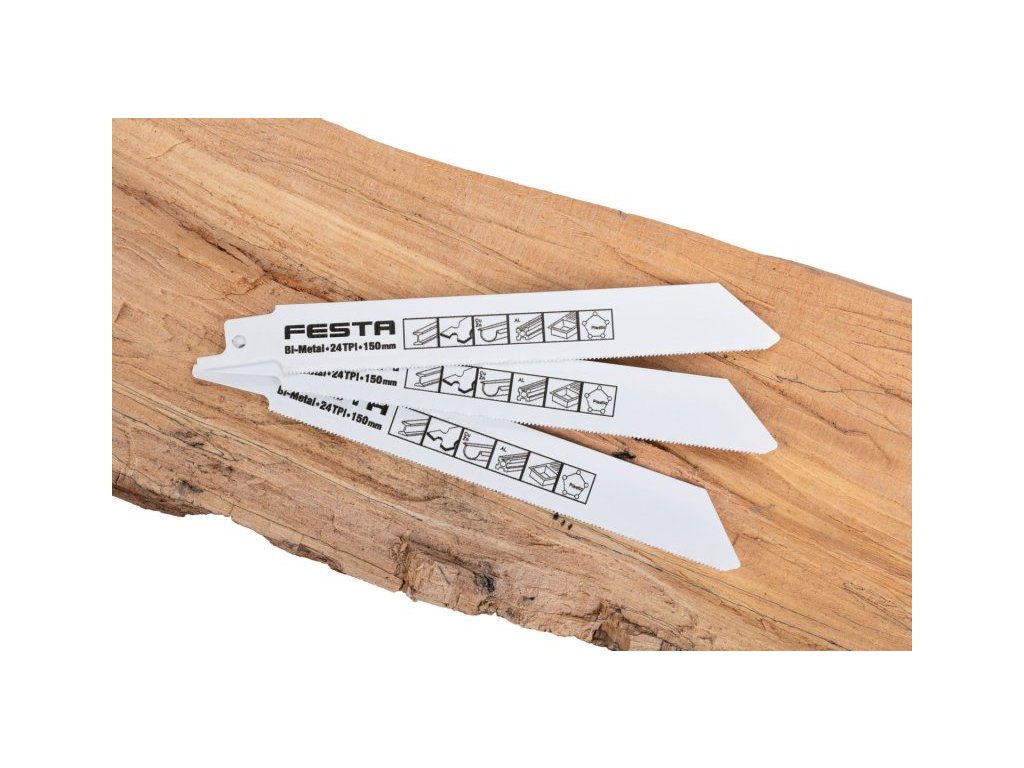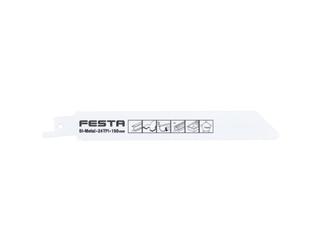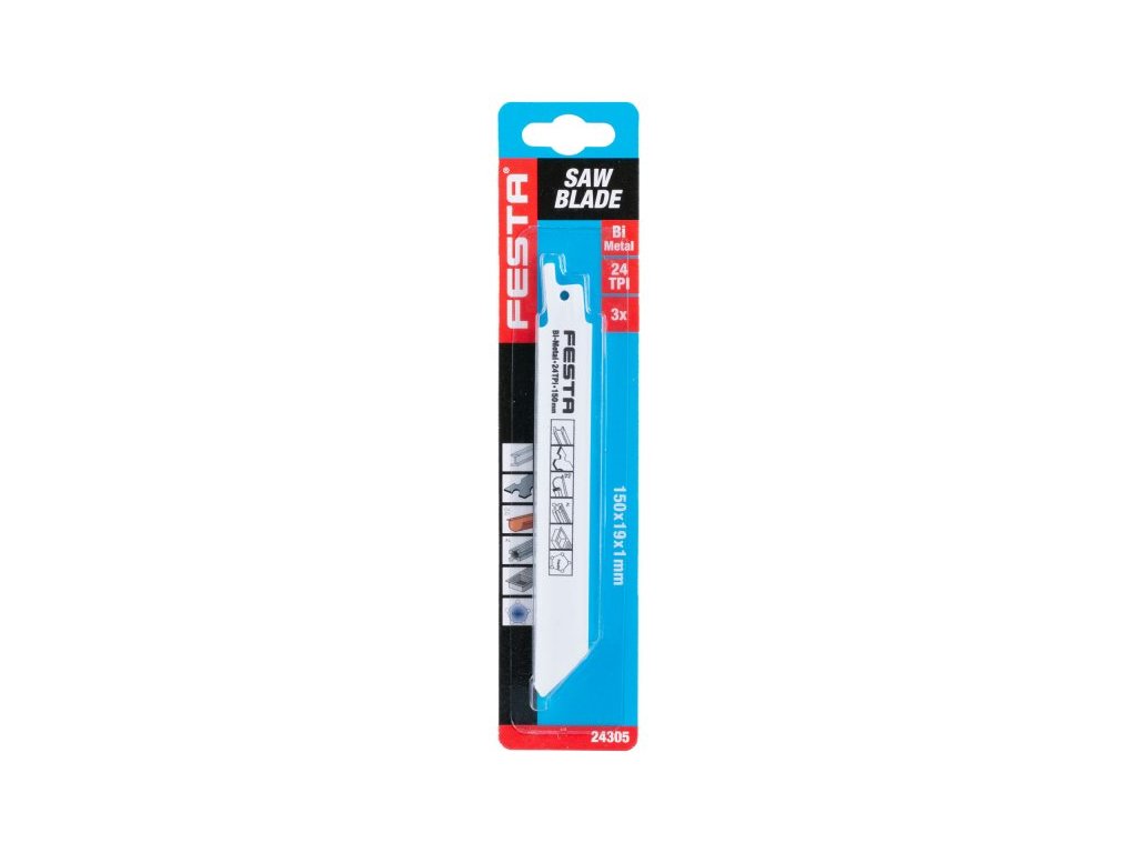 plátek pilový na kovy, plasty do elektrické pily ocasky Bi - Metal - materiál odolávající většímu tepelnému zatížení, delší životnost ostří plátku doporučená maximální tloušťka řezu - plechy 3 mm, kovové profily a trubky 80 mm rozměry : 150 x 19 x 1 mm, počet zubů na palec (TPI) - 24 Instruktážní video