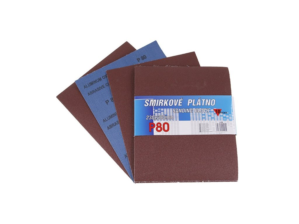 Smirkové plátno - sada 10 kusů, zrnitost: 80, druh zrna: oxid hlinitý, pojivo: syntetická pryskyřice, podkladový materiál : pružná tkanina-100% bavlna (240-260g/m2), rozměry : uvedeny v názvu výrobku, balení : 10 kusů - papírový návlek.