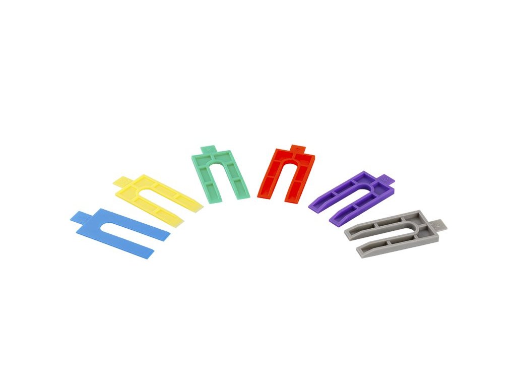 sada plastových vymezovacích podložek různých tlouštěk, pro pdklad a vyrovnávání zakládacích profilů při nerovném povrchu v sadě každé barvě odpovídá jedna tloušťka 1, 2, 3, 4, 5, 6 mm v množství 5 kusů díky tvaru lze jednotlivé vymezovací podložky kombinovat a aplikovat dodatečně, aby se docílila co nejpřasnější rovinnost zakladacích profilů po celé délce stěny