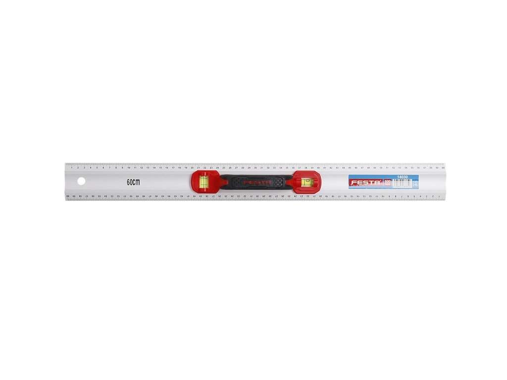 hliníkové pravítko s rukojetí s obustrannou milimetrovou stupnicí délka 60 cm horizontální a vertikální libela pogumovaná ergonomická rukojeť pro přesné umístění a práci
