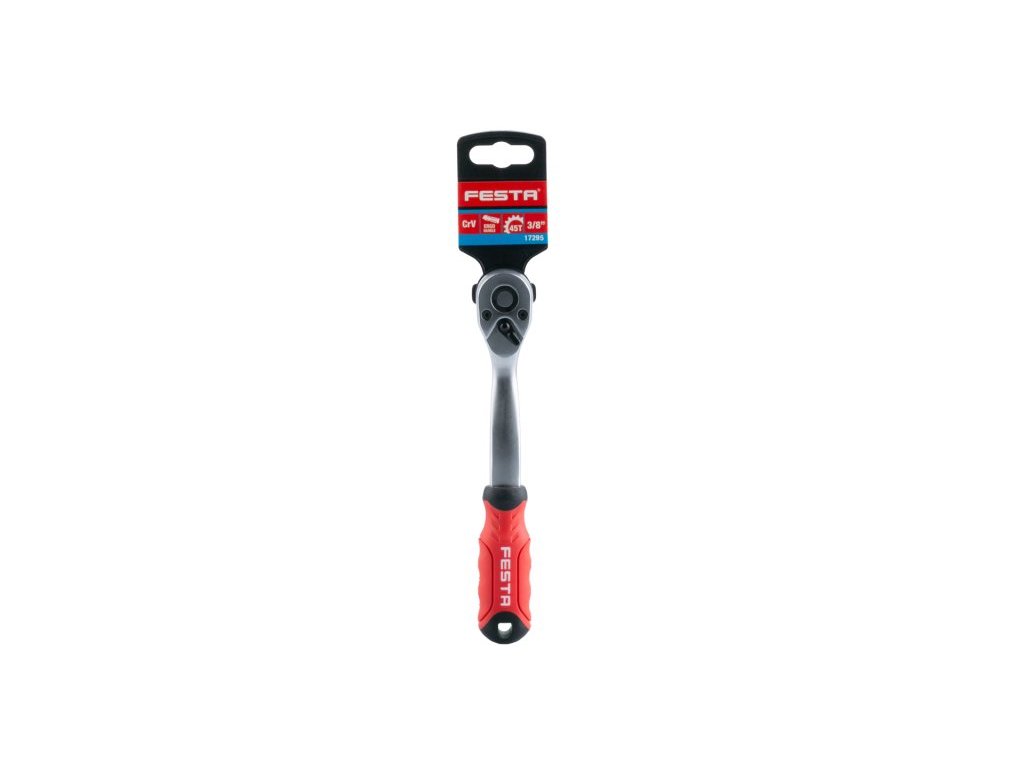 profesionání ráčna z chromvanadiové oceli pro hlavice 3/8" vyhnutý tvare těla pro snadněší práci bez úrazu ráčnový mechnismus z kalené Cr-Mo oceli 45 zubů se záběrem po 10-ti obloukových stupních s přepínáním směru pohybu ráčny - utahování / povolování ergonomická pogumovaná rukojeť - neklouzavá a odolná