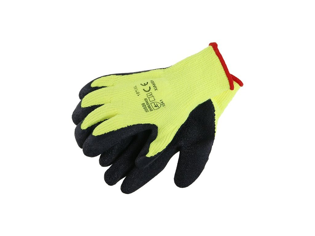 Pletené bezešvé akrylové rukavice, zdrsněná dlaň máčena v černé latexové pěně, zimní, CE EN 388, velikost 10.