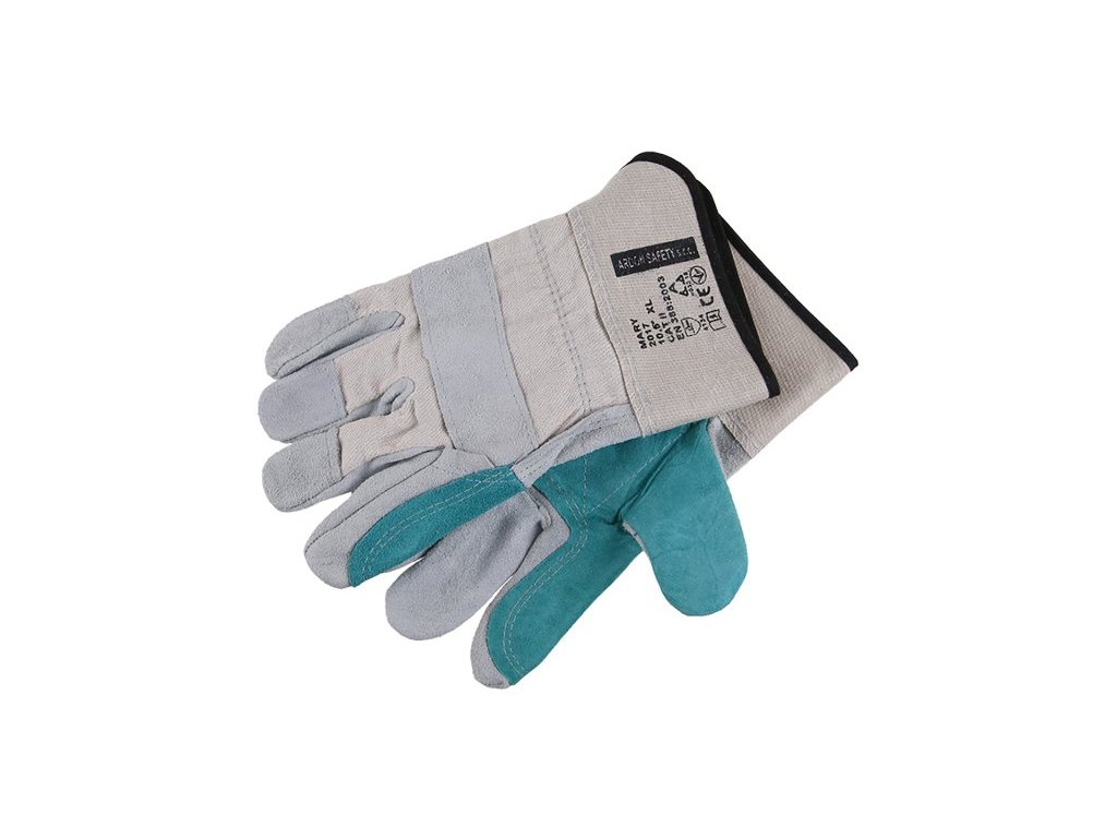Zesílená dlaň a ukazovák z hovězí štípenky, hřbet z bavlněné tkaniny, vyztužená manžeta, CE EN 388, vel. 10,5.