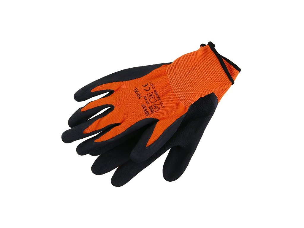 Oranžový úplet z jemného nylonovu, dlaň máčena v černé latexové pěně, CE EN 388, velikost 10.