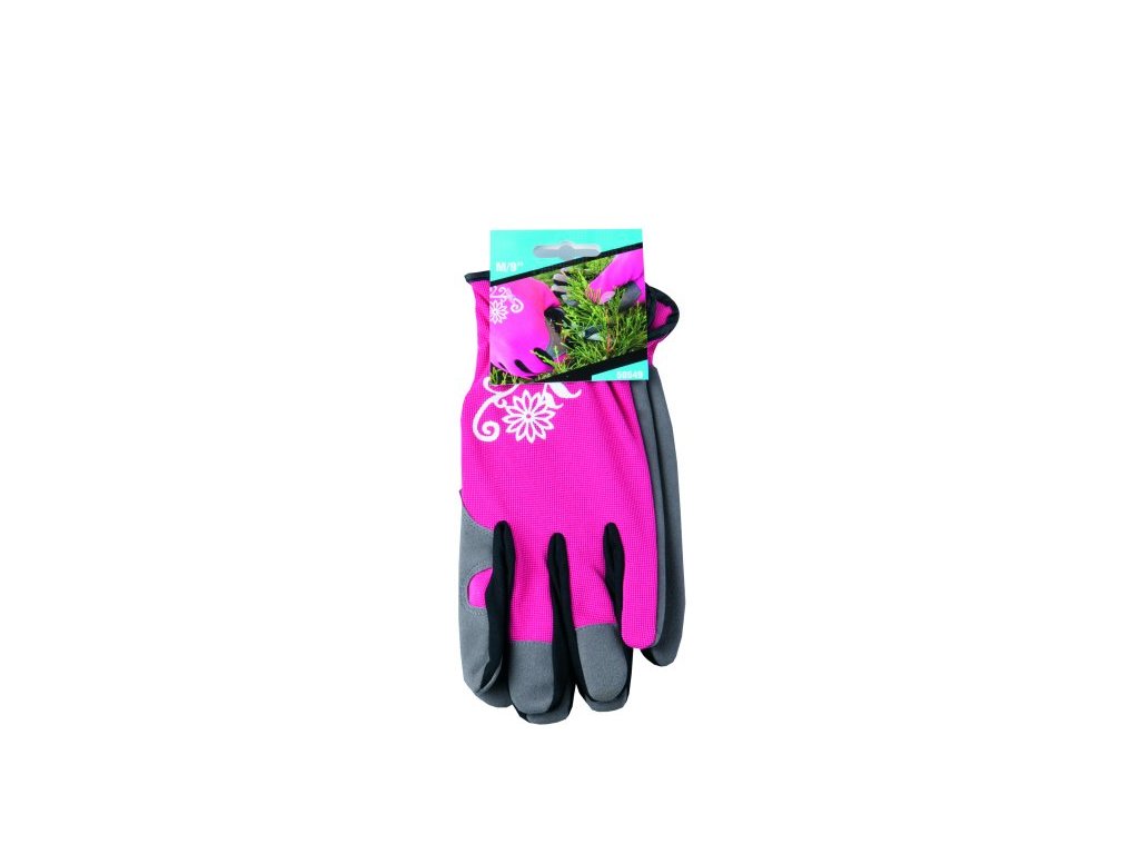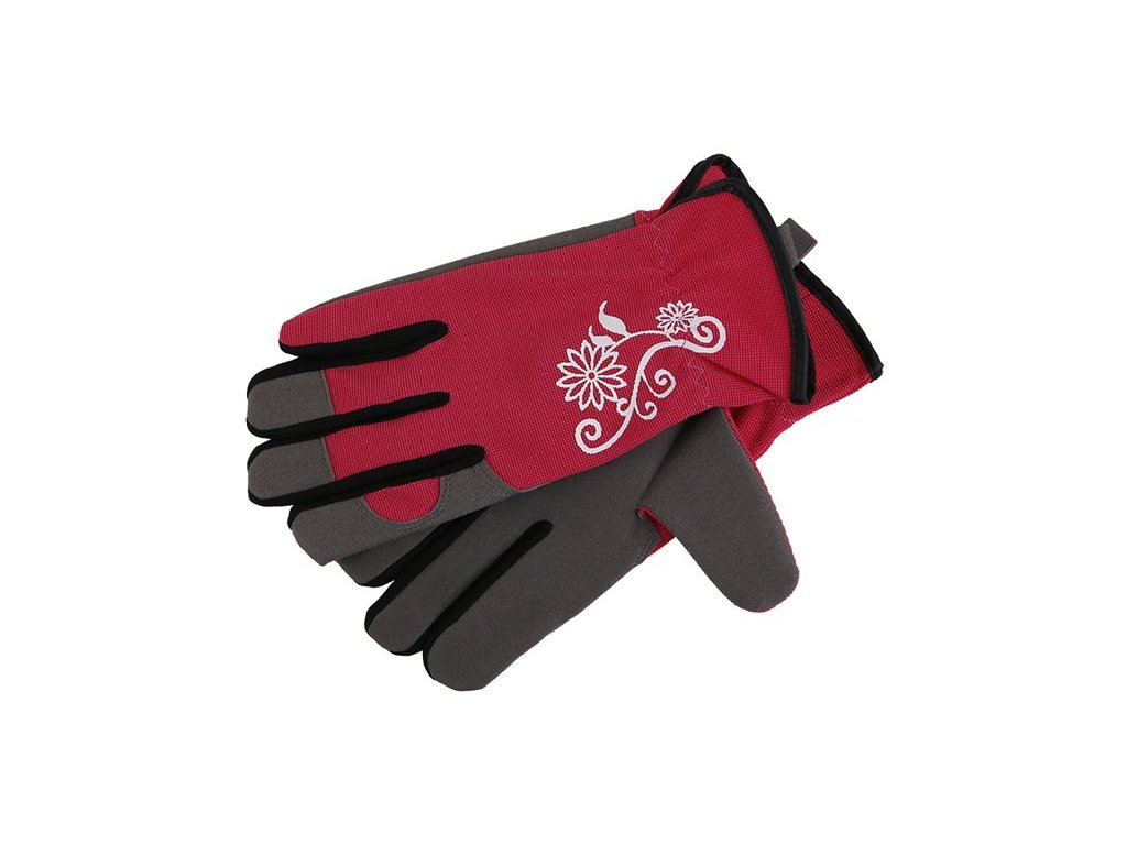Rukavice speciálně vyvinuté pro zahradní práce z umělého semiše v dlani, hřbet rukavice je z elastické tkaniny Spandex, se stahovací gumičkou na zápěstí, ozdobný potisk. Velikost 8.