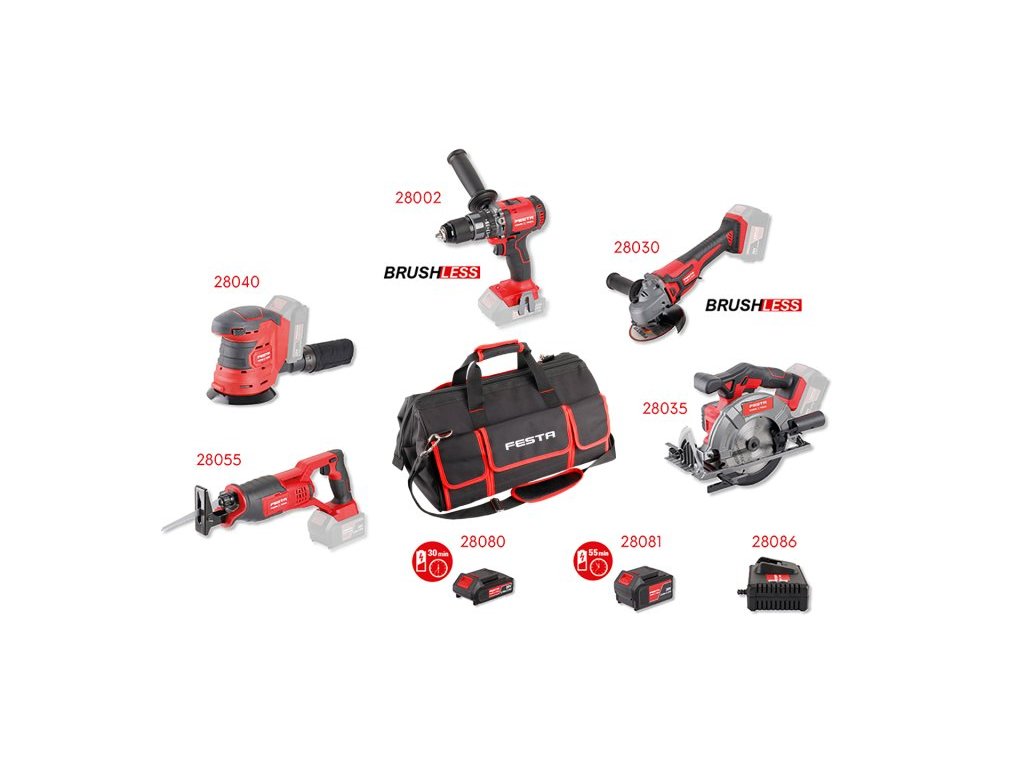 výhodná sestava AKU nářadí FESTA Power tools s praktickou taškou zdarma sestava nejběžněji používaných AKU strojů pro různé druhy prací, stroje jsou součástí systému FESTA SHARE20V s možností využívat Li-ion batarie 2.0 Ah a 4.0 Ah ve všech strojích součástí sady je i rychlonabíječka a baterie 4.0 a 2.4 Ah pro běžnou práci je baterie s kapacitou 2.0 Ah (28080) dostačující - nabíjecí čas 40 min., pro práci s předpokladem větší zátěže, doporučujeme použít baterii s kapacitou 4.0 Ah (28081) - nabíjecí čas 90 min Li-ion technologie použitá v bateriích FESTA Power x tools nabízí možnost dobíjet baterie kdykoliv - bez snižování jejich kapacity, u Li-ion baterií také dochází k jen velmi pomalému samovybíjení stroje v sadě 28002, 28030, 28035, 28040, 28055