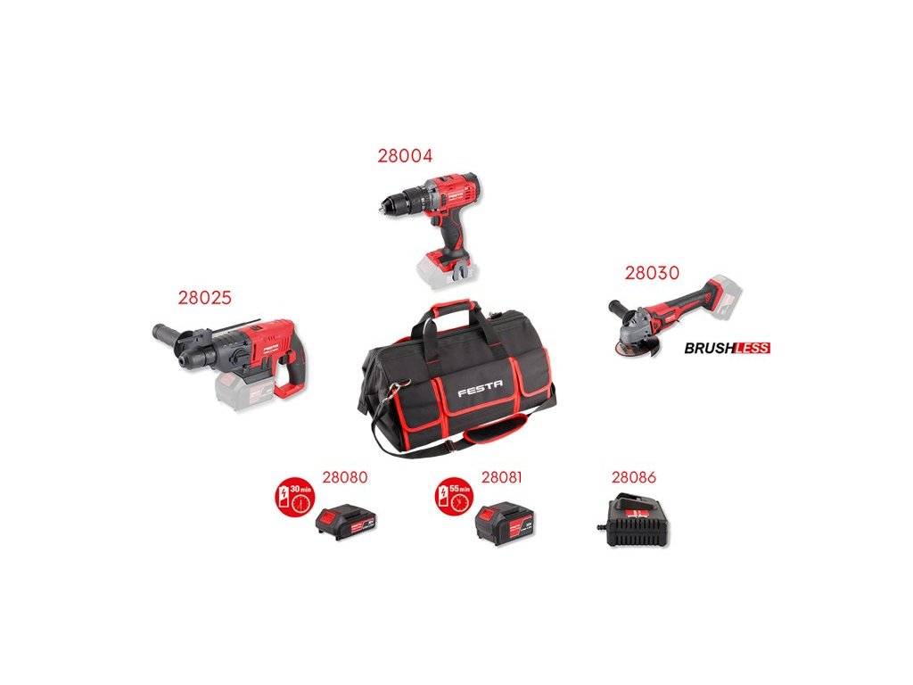 výhodná sestava AKU nářadí FESTA Power tools s praktickou taškou zdarma sestava nejběžněji používaných AKU strojů pro různé druhy prací, stroje jsou součástí systému FESTA SHARE20V s možností využívat Li-ion batarie 2.0 Ah a 4.0 Ah ve všech strojích součástí sady je i rychlonabíječka a baterie 4.0 a 2.4 Ah pro běžnou práci je baterie s kapacitou 2.0 Ah (28080) dostačující - nabíjecí čas 40 min., pro práci s předpokladem větší zátěže, doporučujeme použít baterii s kapacitou 4.0 Ah (28081) - nabíjecí čas 90 min Li-ion technologie použitá v bateriích FESTA Power x tools nabízí možnost dobíjet baterie kdykoliv - bez snižování jejich kapacity, u Li-ion baterií také dochází k jen velmi pomalému samovybíjení stroje v sadě 28004, 28025, 28030