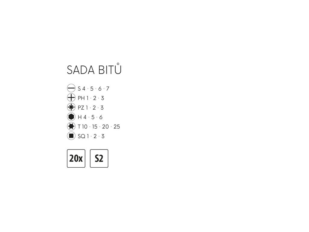 sada bitů v praktickém plastovém zavíracím boxu bity z kvalitní legované oceli S2 obsah sady - S 4* 5 * 6, PH 1 * 2 * 3, PZ 1 * 2 * 3, H 4 * 5 * 6, T 10 * 15 * 20 * 25, SQ 1* 2 * 3 konstrukce krabičky umožňuje pohodlný přístup, rychlý výběr potřebného bitu a přehledné uložení