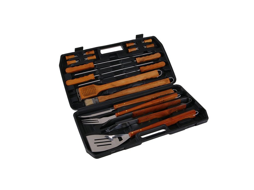 Sada nářadí pro grilování, nerez a dřevo, sada obsahuje ucelený set nářadí pro grilování - složení viz obrázek, použití : pro grilování a vaření, v domácnosti, na zahradě, při kempování…, snadná a bezpečná manipulace s pokrmy při tepelné úpravě na grilu, pánvi..., balení : plastový box.