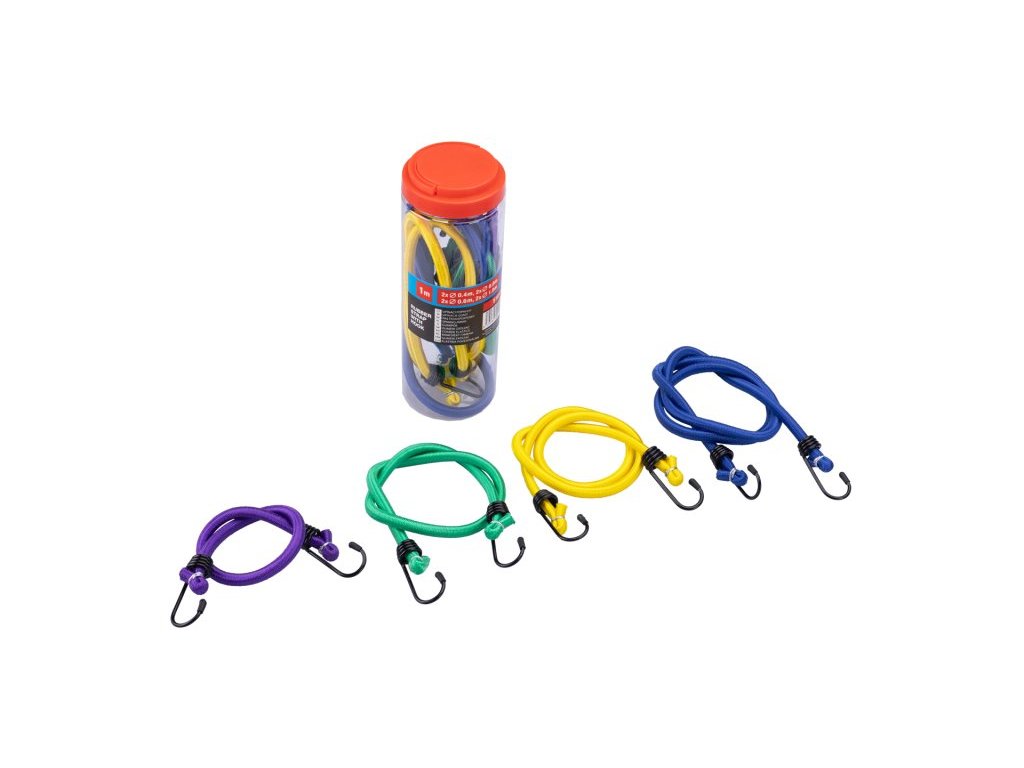 Sada klasických elastických popruhů s ocelovými háky. 2 x délka 0.4, 0.6, 0.8, 1 m. Jsou určené pro fixaci předmětů. Popruh je tvořen z gumových vláken potažených opletem ze syntetické elastické tkaniny.