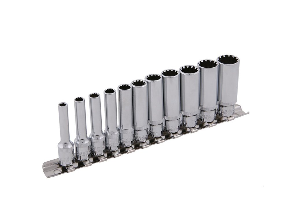 Sada nástrčných hlavic DRIVELOCK. Všechny části jsou vyrobeny z chrom-vanadiové oceli kováním, dobře kombinovaná sada v přehledném kovové organizéru.