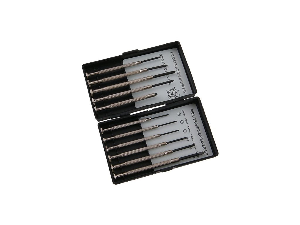 Sada nejpoužívanějších tvarů hrotu a velikostí šroubováků pro jemnou mechaniku a optiku (plochý 11,21,41,82,4 3 + PH00, PH0, PH1). Pro hobby použití.