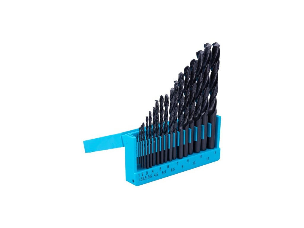 Sada vrtáků HSS DIN 338, RN, je vyrobená z kvalitní rychlořezné oceli (HSS). Přesné vyrobená šroubovice pro kvalitní výkon, přesnost a dobré středění, vybroušení úhlu špičky vrtáku 118°, pro vrtání běžné konstrukční oceli, baleno v PVC krabičce.