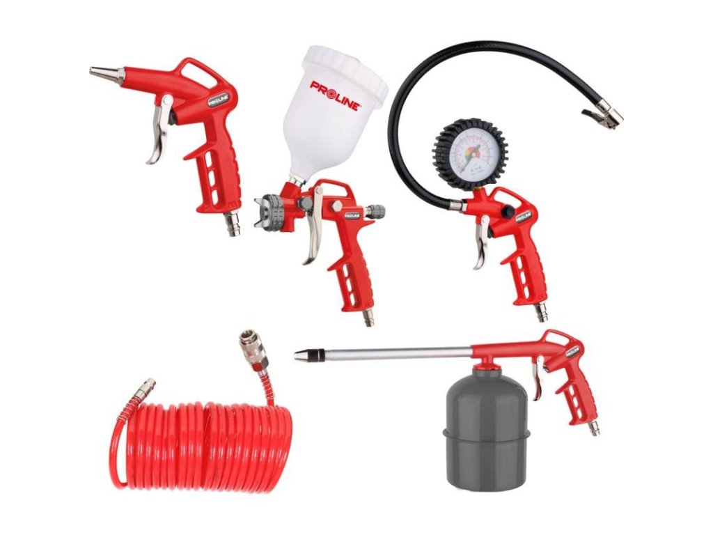 - sada obsahuje: lakovací pistoli s horní nádrží, nafukovací pistole, mycí pistole, ofukovací pistole, PU spirálová pneumatická hadice