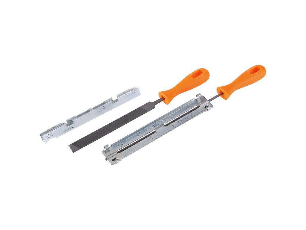 Ostření pilových řetězů mnoha běžných velikostí. S tímto vodítkem pilníku je zcela jednoduché naostřit řetěz, dodržet úhel a hloubku ostření. Průměr kulatého pilníku v sadě je 4 mm.